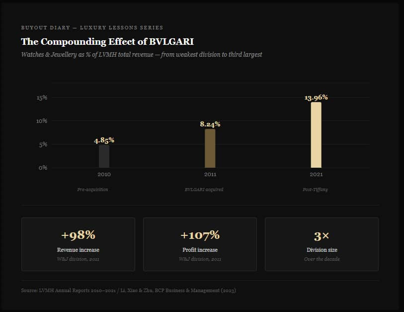 In the year of acquisition alone, LVMH’s Watches and Jewellery division recorded a 98% increase in revenue and a 107% increase in profit. The division’s share of LVMH’s total gross revenue jumped from 4.85% in 2010 to 8.24% in 2011. Every euro of that growth was attributed to the consolidation of BVLGARI. The year after, the division continued to record a 46% revenue increase and a 26% profit increase, exceeding every other LVMH business group in growth rate. The 61% premium Arnault paid looked expensive on the day of the announcement. It looked rational within twelve months.