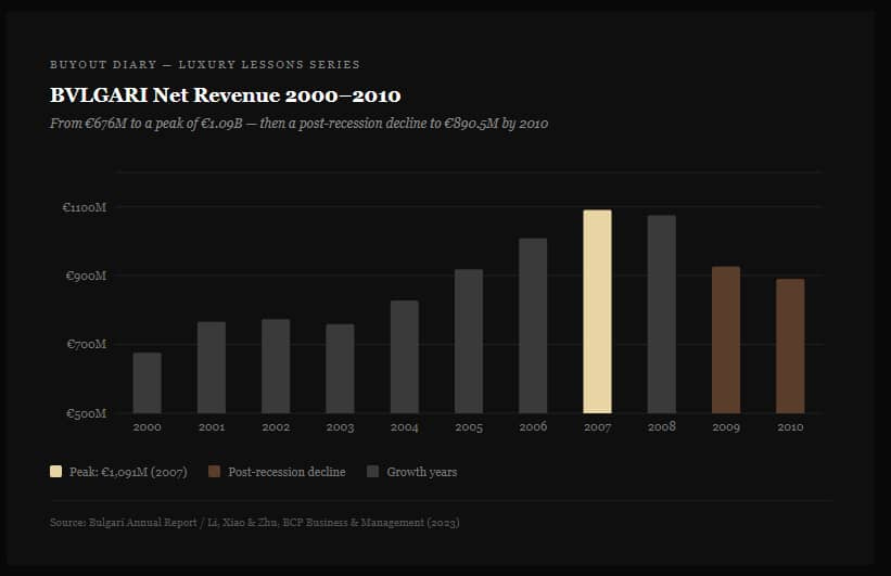 The 2008 recession had hit BVLGARI hard. Net revenue had declined steadily from €1.091 billion in 2007 to €890.5 million in 2010. The brand had made significant store investments during that same period of falling sales — expanding the retail footprint while cash flow was shrinking. The financial muscle needed to grow at the pace the brand deserved was simply not there.