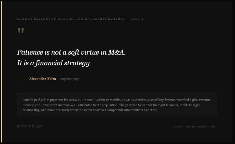 The BVLGARI acquisition is not just a good story about a famous deal. It is a manual for how to think about buying a business when you are playing a long game. The lessons apply at every deal size.