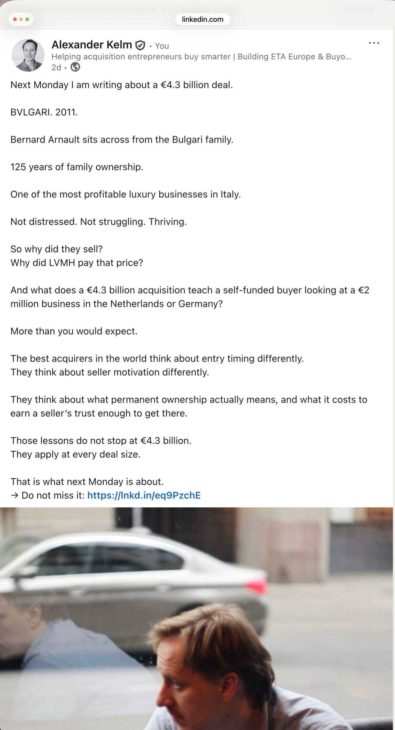And what does Arnault’s answer to those questions teach a self-funded buyer handing over the keys to a 15-person business in the Netherlands or Belgium?