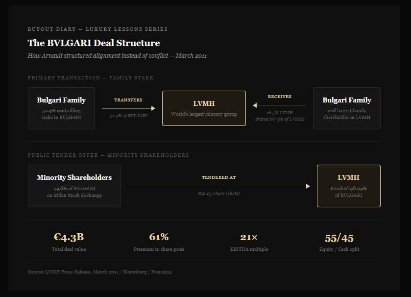 On 7 March 2011, LVMH announced the acquisition of BVLGARI in a deal valued at approximately €4.3 billion. The mechanics of how that deal was structured are worth examining in detail, because they reveal something important about how Arnault thinks.